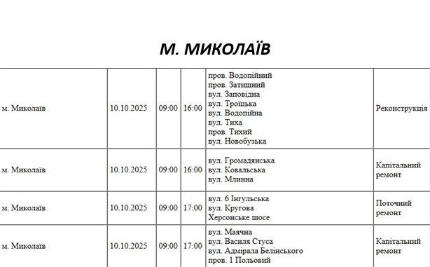 Какие улицы Николаева будут обесточены 10 октября