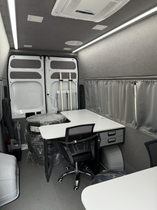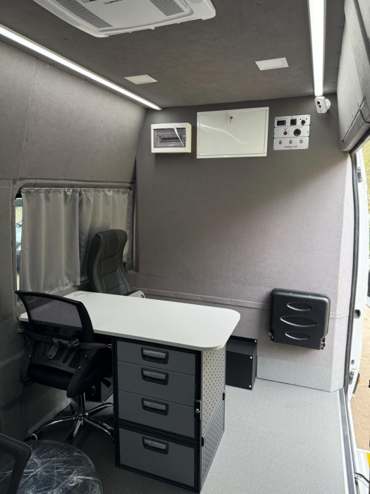 Указывается, что автомобиль оборудован всем необходимым для комфортной работы администраторов и посетителей. Внутри него встроена мебель, отопление, кондиционеры и удобный пандус для людей с инвалидностью и посетителей старшего возраста.