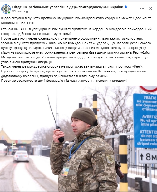 Пункты пропуска Молдовы, граничащие с Украиной в Винницкой области, также работают на дополнительном электропитании, однако пропуск транспортных средств там осуществляется в штатном режиме.