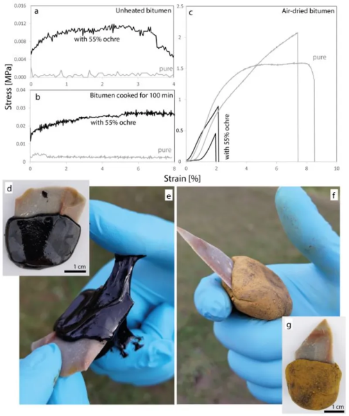Чтобы понять, как неандертальцы могли использовать эту клейкую смесь, исследователи провели эксперименты. Чистый битум оставлял на руках липкие пятна, в то время как смесь с 55% охры ощущалась твердой и не липкой.