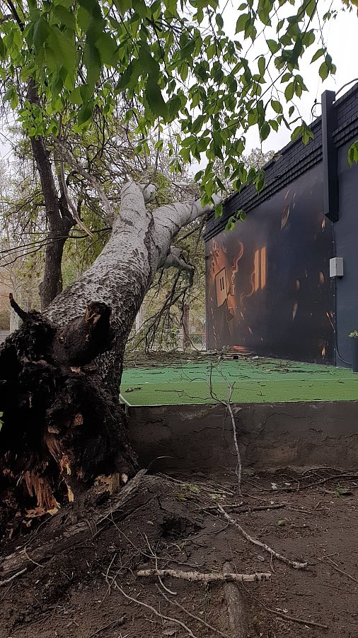 Кроме того, огромные тополя, вывернутые с корнем, упали на припаркованные во дворе автомобили.