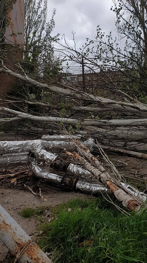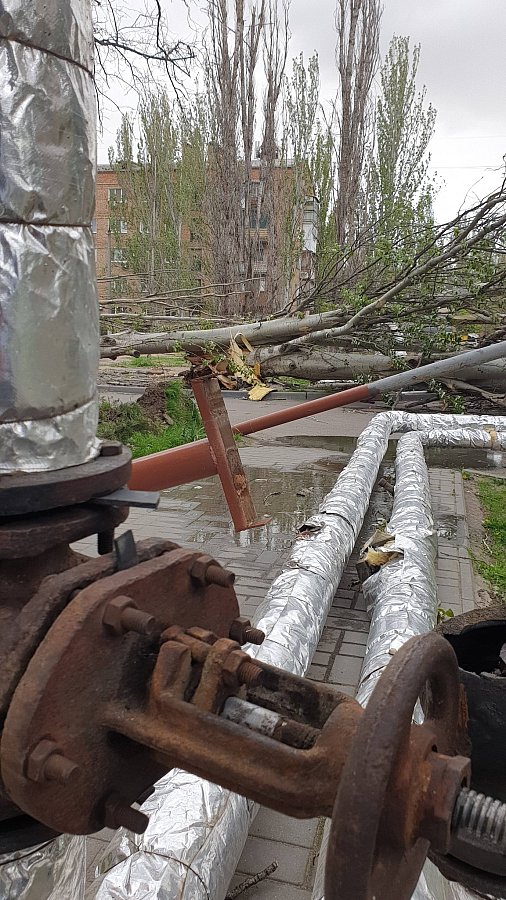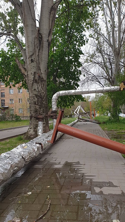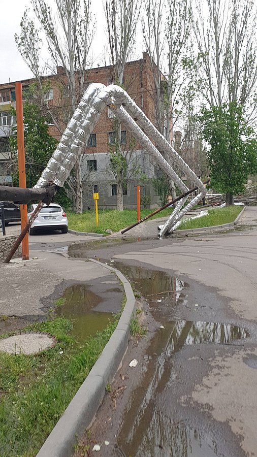В микрорайоне Лески в Николаеве ураган наделал беды: порывы сильного ветра повалили метллические столбы, на которых закреплена воздушная теплотрасса. В результате теплосеть оказалась на земле.
