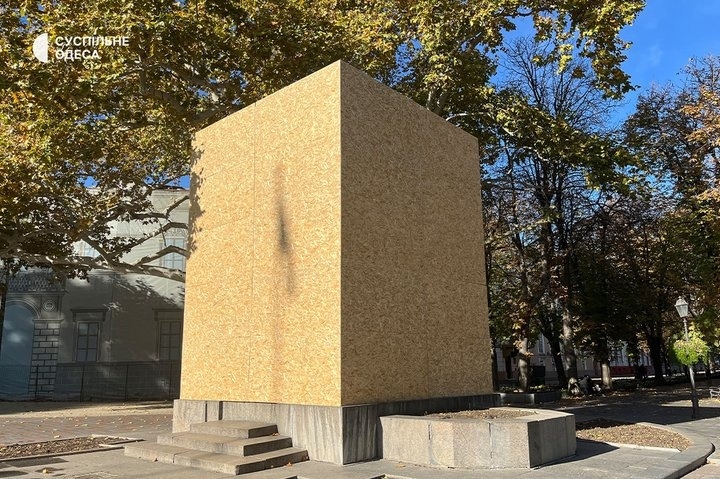 Бюст Пушкина, установленный возле здания Одесской мэрии, закрыли деревянными щитами.