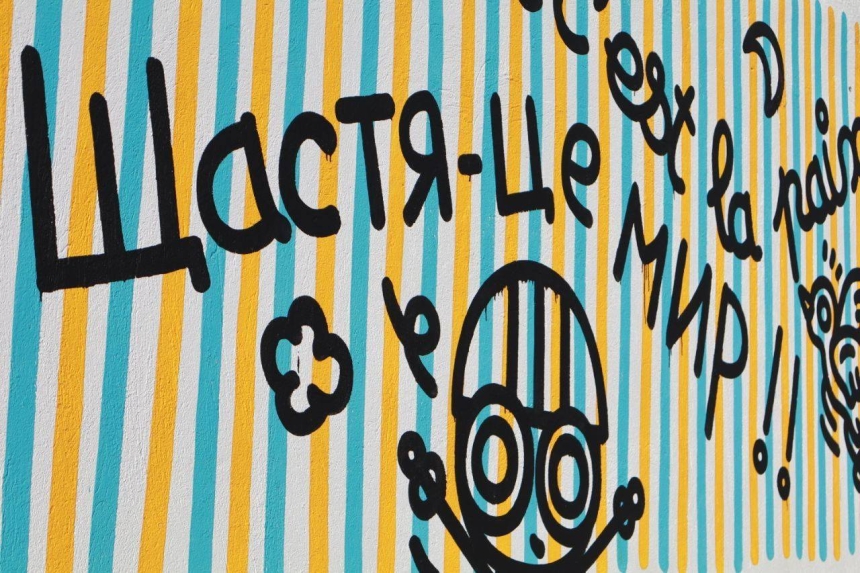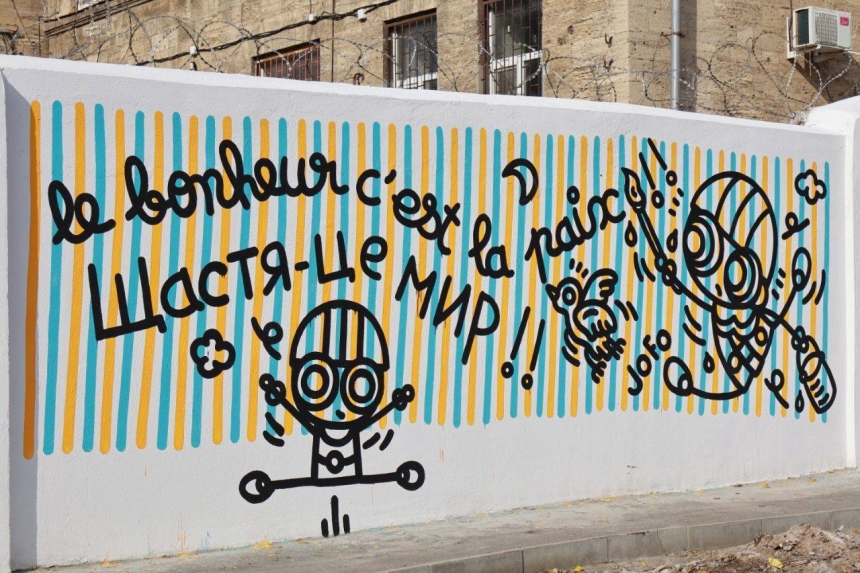 Второй стрит-арт украшает доброжелательный герой Тото, который путешествует по полотнам JoFo, наполняя пространство улыбками и теплом. Рядом с Тото на стене написано послание: «Щастя — це мир / Le bonheur, c’est la paix. Это искреннее послание мира и вдохновения для всех жителей города.