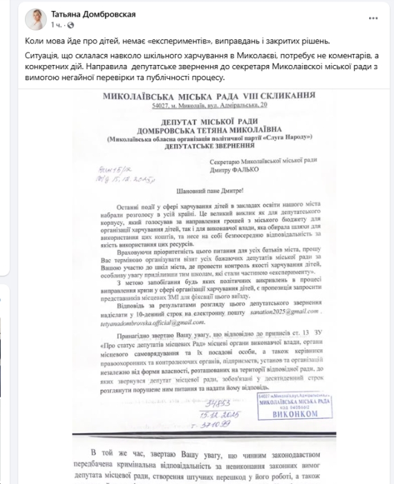 «Коли йдеться про дітей, немає «експериментів», виправдань та закритих рішень. Ситуація, що склалася навколо шкільного харчування в Миколаєві, потребує не коментарів, а конкретних дій. Направила депутатське звернення до секретаря Миколаївської міської ради з вимогою негайної перевірки та публічності процесу», - написала Домбровська.