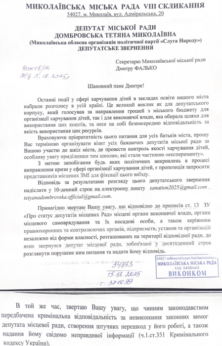 Депутат Тетяна Домбровська звернулася до секретаря міськради Дмитра Фалька з вимогою терміново організувати виїзну перевірку шкільного харчування у місті. Оскільки ситуація з організацією харчування дітей у школах Миколаєва викликала широкий суспільний резонанс та стала предметом обговорення як серед депутатів, так і серед виконавчої влади, відповідальної за використання бюджетних коштів та якість харчування.
