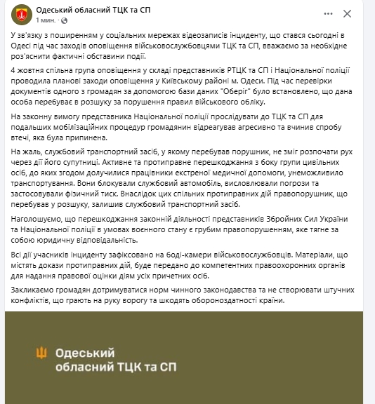 «У зв'язку з поширенням у соціальних мережах відеозаписів інциденту, що стався сьогодні в Одесі під час заходів оповіщення військовослужбовцями ТЦК та СП, вважаємо за необхідне роз'яснити фактичні обставини події.
