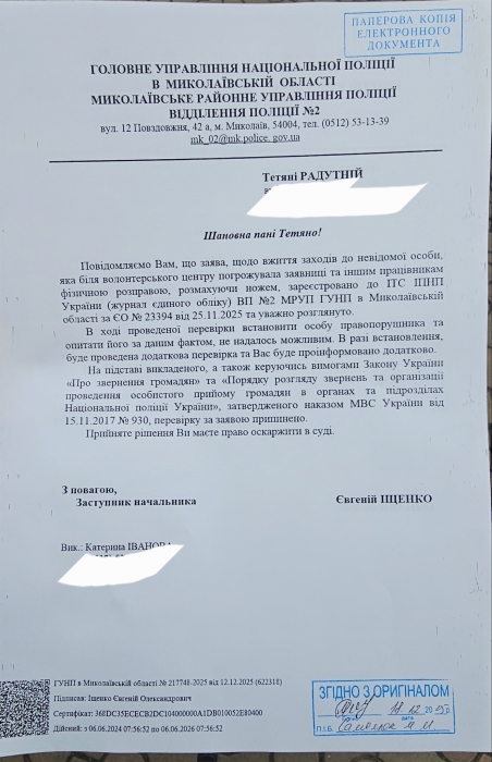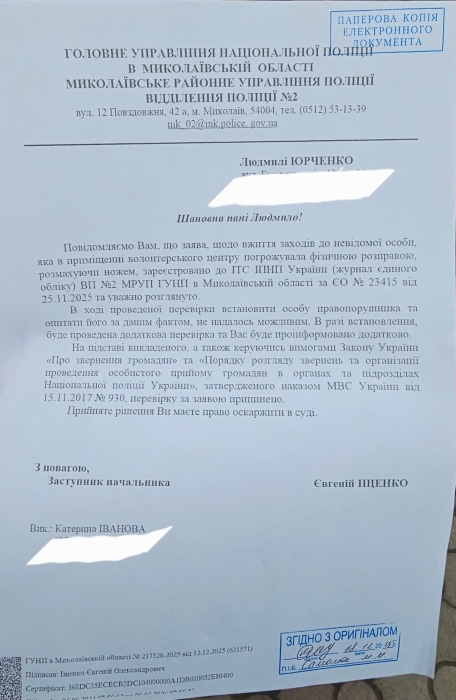 — Чоловік із холодною зброєю кидався на нас. Погрожував, що він повернеться. Повернеться з вибухівкою. Це ми всі говорили. Телефонували ми у відділення поліції, по телефону нам не могли надати відповідь – треба приходити у прийомні дні. Прийшли ми і отримали дві відповіді… Що пишуть: «під час проведеної перевірки встановити особистість правопорушника і опитати його за цим фактом не вдалося. У разі встановлення буде проведено додаткову перевірку та вас буде поінформовано додатково. На підставі викладеного, а також керуючись Законом України «Про звернення громадян та порядок розгляду заяв»… перевірку припинено. Ухвалене рішення ви маєте право оскаржити в суді». Тобто людину ми затримали до приїзду поліції, тримали її, передали з рук в руки поліції, поліція на місці встановила особу людини… людина ця перебувала у відділенні кілька годин, було викликано ВСП (військова служба правопорядку), їй викликали «швидку допомогу» і в результаті не встановлено особу» , - обурилася на відео Міла Юрченко.