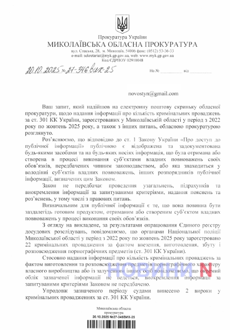 Крім того, як стало відомо, з початку повномасштабного вторгнення в Миколаївській області відкрили 22 кримінальні провадження за фактами виготовлення, продажу та розповсюдження порнографії. Однак лише двоє обвинувачених отримали вироки суду.