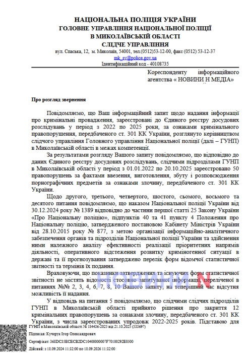 У прокуратурі та поліції Миколаївської області не знають, які суми витрачаються на розслідування справ за ст. 301 КК України - виготовлення, продаж та розповсюдження порнографії.