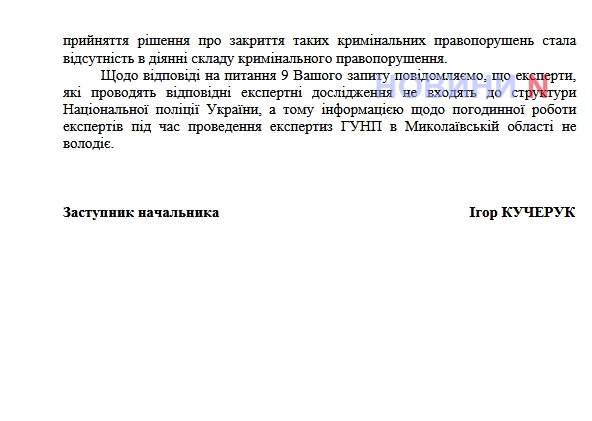 «Щодо відповіді на запитання 9 Вашого запиту повідомляємо, що експерти, які проводять відповідні експертні дослідження, не входять до структури Національної поліції України, а тому інформації про погодинну роботу експертів під час проведення експертиз ГУНП у Миколаївській області не володіє», - сказано у відповіді поліції.
