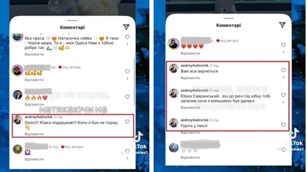 Під одним із її дописів Федінчик написав, що під час його відсутності акторку нібито пов’язували близькі стосунки з моделлю Юрієм Савранським. Згодом ці повідомлення були видалені, проте скриншоти поширилися в Мережі.