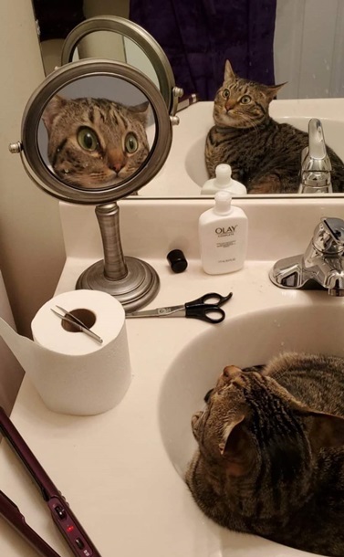 На фото запечатлен кот, лежащий в раковине перед зеркалом. На умывальнике стоит увеличительное косметическое зеркальце, в котором животное и увидело себя.