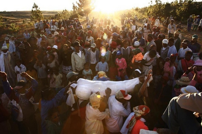 Фамадихана , что означает "поворот костей", это традиционный фестиваль, который проходит на Мадагаскаре. Участники считают, что чем быстрее тело разлагается, тем быстрее душа достигает загробной жизни. Поэтому они выкапывают своих усопших близких и танцуют с трупами вокруг могилы, а затем перезахороняют их.