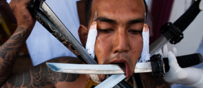 Во время ежегодного Вегетарианского фестиваля на острове Пхукет, Таиланд проводится очень необычный мазохистский ритуал. Во время его участники протыкают свои щеки копьями, ножами, мечами и крюками. Считается, что боги вводят тела участников ритуала в транс, защищая их от зла и принося удачу.