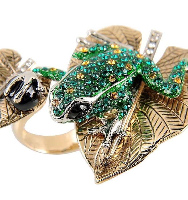 Roberto Cavalli – бренд, который специализируется на выпуске элитной модной одежды. В этом году марка выпустила коллекцию украшений, посвящённых братьям нашим меньшим. Среди представленных экземпляров достаточно реалистичным можно считать кольцо на два пальца. На нём сидит зелёная лягушка, и кажется, что она вот-вот спрыгнет с украшения.