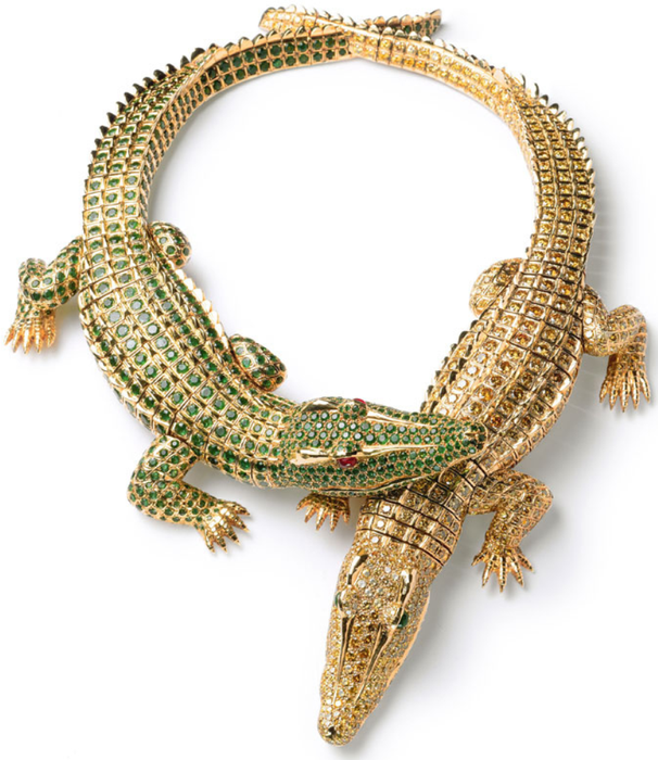 Поразительное винтажное колье Crocodiles, от всемирно известного ювелирного бренда Cartier, было изготовлено ещё в 1975 году, но до сих пор восхищает знатоков драгоценностей. Оно выполнено из золота, покрыто жёлтыми бриллиантами, изумрудами и рубинами. Крокодилы при желании отсоединяются и могут использоваться, как отдельные броши.