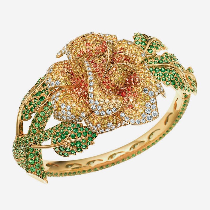В прошлом году ювелиры компании Tiffany создали браслет, на котором расцвела ювелирная роза. Она выполнена из 18-каратного золота и покрыта цветными драгоценными камнями – редчайшими спессартинами, сочными цаворитами, прозрачными и фантазийными бриллиантами.