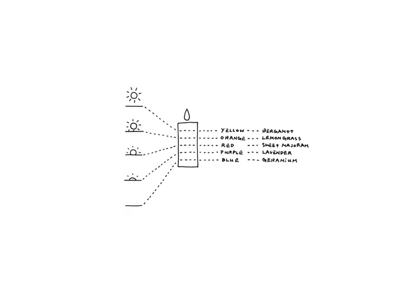 Со стороны свеча выглядит обычного белого цвета. Но при горении она постепенно меняет цвет на желтый, оранжевый, красный, фиолетовый и синий. Внутри помещены ароматические красители, которые имитируют цвета неба при заходе солнца.