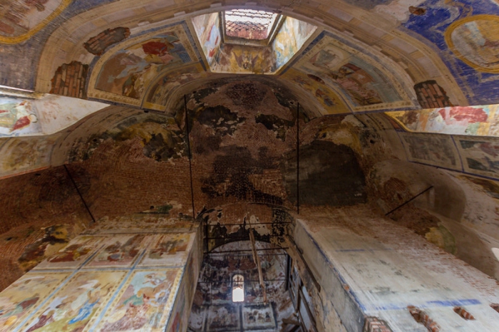 В советское время в храме была устроена тракторная станция. От дыма своды и стены закоптились, и большая часть росписей была уничтожена. Рассматривать украшенные декоративными элементами арки, пилоны и ярусы, а также живописные формы сводов приходится под слоями пыли.