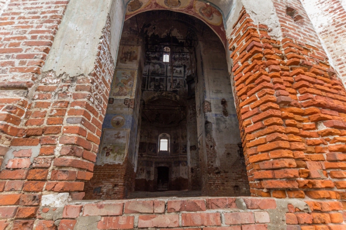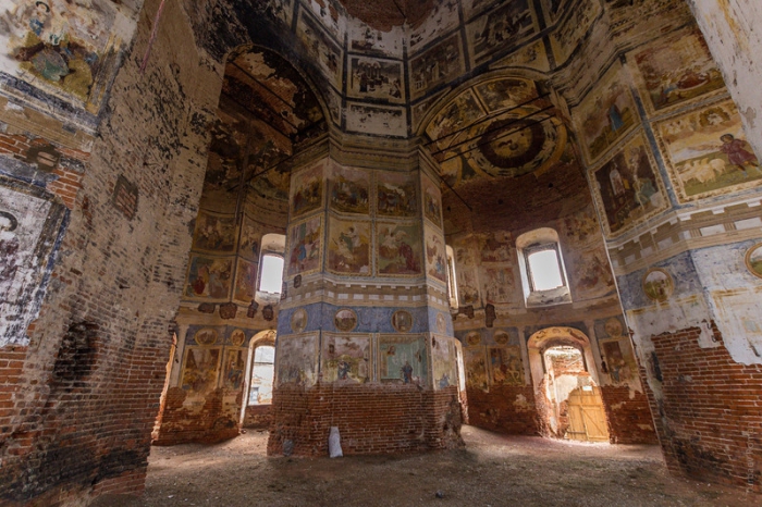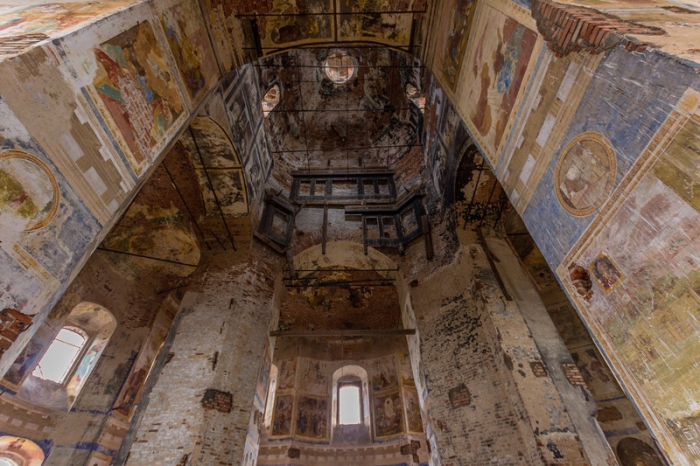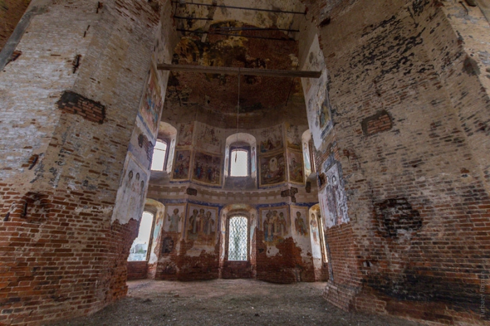Церковь была закрыта в 1930 году, ценные иконы – уничтожены. Окна в ней выбиты, под ногами - мусор и грязь. Внутри на стенах Казанской церкви можно увидеть настоящие древние шедевры искусства.