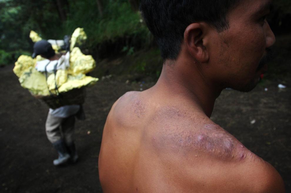 Серу здесь добывают в совершенно немыслимых условиях. Носильщики без спецодежды переносят по 70-80 кг сырья в обычных корзинах на спине. Дневная зарплата работника — около $5. Еще совсем молодые мужчины выглядят как старики и еле доживают до 30 лет. Сера используется для вулканизации резины, обесцвечивания сахара и в других промышленных процессах. Сфера ее применения велика.